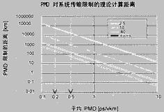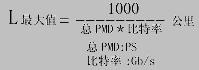 圖2 由PMD限制傳輸?shù)睦碚摼嚯x 直到幾年以前,在數(shù)字和模擬系統(tǒng)中,當(dāng)數(shù)據(jù)傳輸率較低和距離相對(duì)較短時(shí),PMD對(duì)單模光纖系統(tǒng)的影響微不足道。隨著對(duì)帶寬需求的增長(zhǎng),特別是在10Gb/s及更高速率的系統(tǒng)中,PMD開始成為限制系統(tǒng)性能的因素,因?yàn)樗鼤?huì)引起過大的脈沖展寬或造成過低的信噪比(SNR)。圖2展示了由PMD限制傳輸?shù)木嚯x[2]。 由于PMD限制的系統(tǒng)最大距離,從理論上可由下面公式得出: