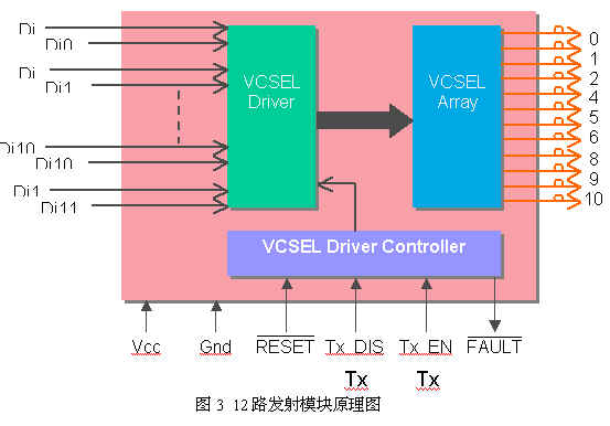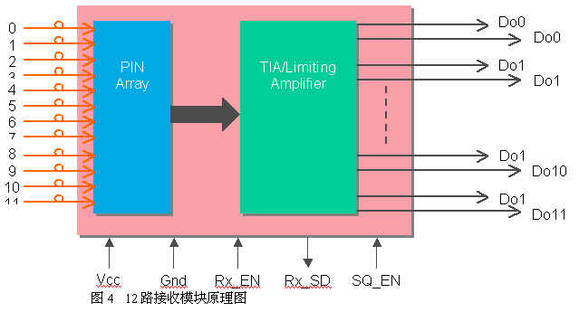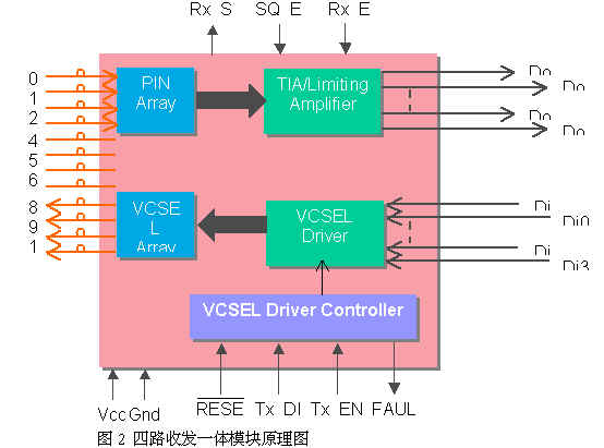 圖2是收發(fā)一體模塊的示意圖.它有4路發(fā)射和4路接收通道,每一通道的速率可達3.125Gbps,總互連容量可達12.5Gbps.
