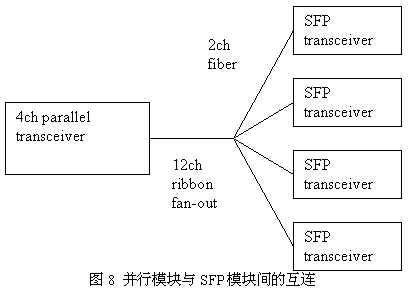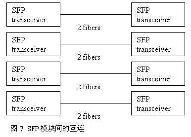 3.超級計算機中的刀片服務器 由于超級計算機是由多個CPU并行計算,數據處理和交換容量大,光互連是其內部連接的理想選擇。在超級計算機系統(tǒng)中,一般采用4路收發(fā)一體并行光模塊。 4.光纖通道 2X光纖通道一般采用2.125GbpsSFP模塊,其互連示意圖如圖7:
