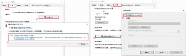 3.U不能復(fù)制盤中的文件? ① 或者先檢查修復(fù)U盤,點擊U盤,右鍵【屬性】,依次選擇【工具】-【檢查】-【掃描修復(fù)驅(qū)動器】修復(fù)。 ② 維修完成后,更換共享選項卡,選擇高級共享,檢查共享文件夾,單擊以確定保存
