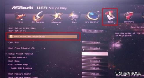3.按方向鍵移動進入頁面【Boot】,在頁面底部選擇【Hard Drive BBS Priorities】按回車鍵進到。