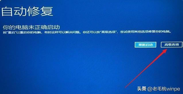 即將介紹進(jìn)入安全模式的重新安裝Windows系統(tǒng)方法~ 以安裝win10為例: 1.按電源鍵強(qiáng)制關(guān)機(jī)-啟動(dòng),此步驟重復(fù)三次。 2.當(dāng)系統(tǒng)被判定為問題時(shí),它將跳轉(zhuǎn)到自動(dòng)修復(fù)界面。 3.此時(shí)將顯示計(jì)算機(jī)未能正確啟動(dòng),然后單擊高級(jí)選項(xiàng)。