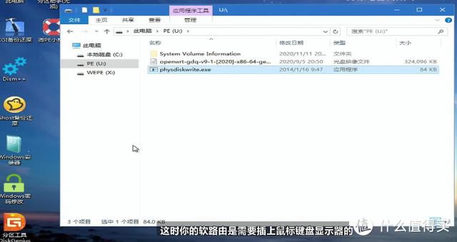 制作系統(tǒng)啟動(dòng)U盤(這里我用的微PE),一個(gè)作為軟路由mini小主機(jī)(插入鼠標(biāo)鍵盤和顯示器)OpenWRT的img圖像文件(這個(gè)版本很多,我選的是eSir大神的高大全固件),physdiskwrite寫圖像文件的工具。