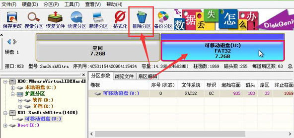 ![]() 2、在打開的diskgenius分區(qū)工具中,選中可移動(dòng)磁盤部分的分區(qū),點(diǎn)擊刪除分區(qū)按鈕,如圖: