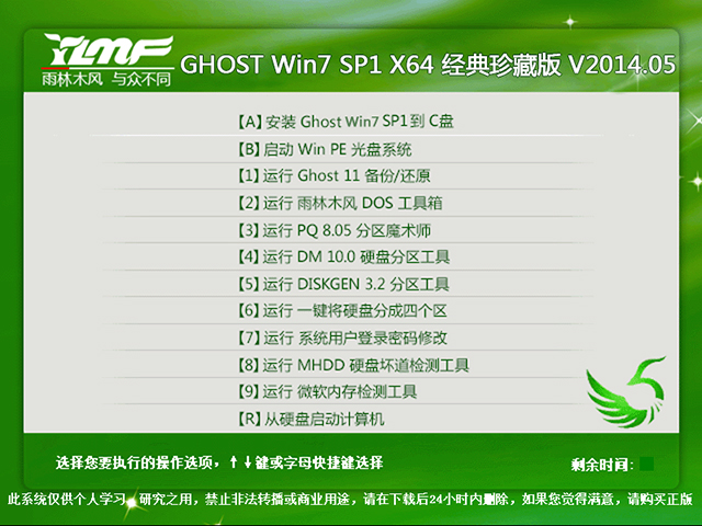 (Chinese-Simplified) 操作系統(tǒng),并進行永久激活,集成系統(tǒng)補丁至2014.05(可通過微軟漏洞掃描) * 辦公套件采用的是精簡版Office2007,集成Office補丁至2014.04(可通過微軟漏洞掃描) * 安裝過程會自動刪除各分區(qū)下可能存在的AUTORUN病毒,刪除灰鴿子及磁碟機病毒。 * 無新建用戶帳戶,僅保留Administrator,密碼為空。(用戶裝好系統(tǒng)后請及時加密碼) * 關(guān)閉了硬盤各分區(qū)的默認共享(如C$、D$、E$ ……),系統(tǒng)更安全。 ★ 更穩(wěn)定 * 包含絕大多數(shù)的SATA,SCSI,RAID控制器驅(qū)動,支持64位處理器,支持雙核處理器。 * 集成了數(shù)百種常見硬件驅(qū)動,經(jīng)過作者精心測試,幾乎所有驅(qū)動能自動識別并安裝好。 * 獨創(chuàng)全新的系統(tǒng)雙恢復(fù)模式,解決了某些SATA光驅(qū)和有隱藏分區(qū)的電腦不能正常安裝系統(tǒng)的問題。 * 支持IDE SATA USB 光驅(qū)安裝,解決了其他GHOST系統(tǒng)在部份SATA或有隱藏分區(qū)的電腦上無法正;謴(fù)的問題。 * 安裝過程會運行自主開發(fā)的驅(qū)動選擇工具,此工具可智能判斷所有的電腦硬件型號,最大限度地避免了因驅(qū)動沖突而藍屏的現(xiàn)象。 ★ 更人性化 * 集成維護人員工具,不僅裝機方便,維護更方便。 * 預(yù)置多種精美主題、壁紙、屏保和精心收藏IE實用收藏夾。 * 智能判斷電腦類型,是臺式機就打開小鍵盤燈,是筆記本就關(guān)閉小鍵盤燈。 * 瞬間把硬盤分成四/五個區(qū),讓每個人都懂得分區(qū),分區(qū)不再是難事(適合新硬盤使用)。 * 安裝過程中可聽聽歌、玩玩小游戲、設(shè)置系統(tǒng)屬性、查看設(shè)備管理器等功能(此功能為雨林木風(fēng)家園首創(chuàng))。 * 我的文檔、收藏夾、都位于D盤。這樣做可以避免下次重裝系統(tǒng)時丟失用戶個人文件。 ★ 功能增強 * 優(yōu)化注冊表,提高系統(tǒng)性能。 * 禁用少量服務(wù),提高系統(tǒng)運行效率。 * 破解連接數(shù)為1024,大大加快下載速度。 * 破解uxtheme主題限制,可直接使用第三方主題。 * 集成DX最新版本,MSJAVA虛擬機,VBVC常用運行庫。 二、安裝說明 ===================== 1.光盤安裝(推薦) 安裝前準備: 請用刻錄軟件,選擇 映像刻錄 方式來刻錄ISO文件,刻錄之前請先校驗一下文件的準確性,刻錄速度推薦24X! 請注意備份硬盤上重要資料。 安裝前請確認該硬盤是否需要分區(qū),如需要,請參考以下分區(qū)方法執(zhí)行分區(qū)操作后進行安裝,如不需要,可直接執(zhí)行安裝部分 分區(qū)方法: 方法一: 分區(qū)請設(shè)置光盤啟動,然后選擇“DiskGenius 圖形分區(qū)工具”,執(zhí)行分區(qū)操作,切記設(shè)置活動分區(qū),并存盤。 方法二: 分區(qū)請設(shè)置光盤啟動,然后選擇“PQ 經(jīng)典分區(qū)工具”,執(zhí)行分區(qū)操作,切記設(shè)置活動分區(qū)。 方法三: 分區(qū)請設(shè)置光盤啟動,然后選擇“瞬間把硬盤分4/5區(qū)(慎用)”,進入子菜單,根據(jù)你的個人需要選擇分四區(qū)還是五區(qū),執(zhí)行后續(xù)分區(qū)步驟。 安裝部分: a.自動安裝 方式一: 安裝請設(shè)置光盤啟動,然后選擇“安裝 GHOST WIN7 系統(tǒng)”就可以自動安裝! 方式二: 安裝請設(shè)置光盤啟動,然后選擇“安裝 GHOST WIN7 系統(tǒng)”,將自動進入DOS進行安裝! b.手動安裝(就使用魔法豬重裝系統(tǒng)大師。 方法一: 安裝請設(shè)置光盤啟動,然后選擇“進入 WinPE 微型系統(tǒng)”進入PE后,點擊“安裝系統(tǒng)”就可以安裝! 方法二: 安裝請設(shè)置光盤啟動,然后選擇"DOS工具箱",進入帶幫助信息的命令提示符狀態(tài),此時輸入GHOST即可執(zhí)行手動安裝 方法三: 安裝請設(shè)置光盤啟動,然后選擇“運行 Ghost 備份還原”,即可進入手動GHOST狀態(tài)。 2.硬盤安裝(適合無光驅(qū)或者不想浪費光盤的用戶,但是需要你有一個可以使用的Windows系統(tǒng)) 請?zhí)崛SO中的“WIN7.GHO”和“GHO鏡像安裝器.EXE”到你的非系統(tǒng)分區(qū),然后運行“GHO鏡像安裝器.EXE”,直接回車確認還原操作,再次確認執(zhí)行自動安裝操作。(執(zhí)行前注意備份C盤重要資料!) 綜上所述,這就小編給你們推薦的雨林ghost