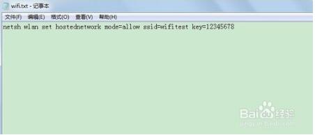 Windows 7,中文名稱視窗7,是由微軟公司(Microsoft)開發(fā)的操作系統(tǒng),內(nèi)核版本號為Windows NT 6.1。Windows 7可供家庭及商業(yè)工作環(huán)境:筆記本電腦 、平板電腦 、多媒體中心等使用。和同為NT6成員的Windows Vista一脈相承,Windows 7繼承了包括Aero風格等多項功能,并且在此基礎上增添了些許功能。 很多win7用戶都向小編反映說,win7開wifi方法不會,那怎樣才能實現(xiàn)win7開wifi呢?說實話win7開wifi非常簡單,只需要短短三個步驟,就能完成win7開wifi方法了。接下來,小編就給大家?guī)碜詈唵螌嵱玫膚in7開wifi方法介紹。 第一步:在桌面上新建一個文本文件(即txt文件),打開文本文件,輸入 netsh wlan set hostednetwork mode=allow ssid=wifitest key=12345678 wifitest可以隨意命名,就是你搜索的wifi名稱,而key就是連接wifi的密碼,也可以隨意更改。 輸入完成保存(ctrl+s),更改下文件后綴名,把txt改成bat。 鼠標右鍵點擊,以管理員身份運行(如果沒有這個就直接運行)