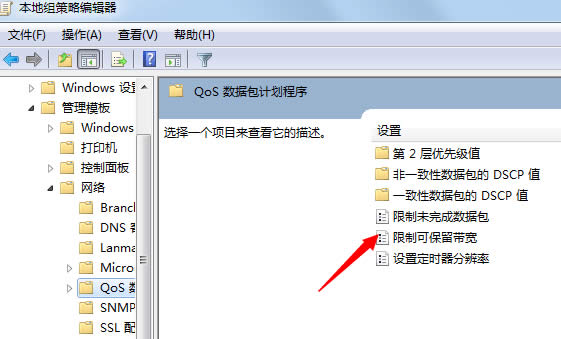 接下來依次展開計算機配置、管理模板、網(wǎng)絡(luò)、qos數(shù)據(jù)報計劃程序選項,然后在右邊的選項中選擇限制保留寬帶并雙擊進入。