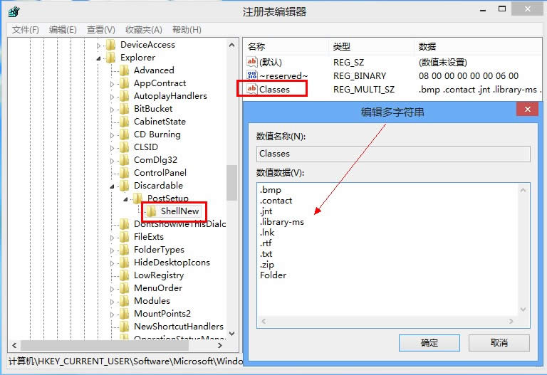 2.打開(kāi)注冊(cè)表后依次找到 HKEY_CURRENT_USER\Software\Microsoft\Windows\CurrentVersion\Explorer\Discardable\PostSetup\ShellNew\Classes,右鍵點(diǎn)擊修改。填出修改框之后自己調(diào)整需要修改的文件順序,點(diǎn)擊確定。