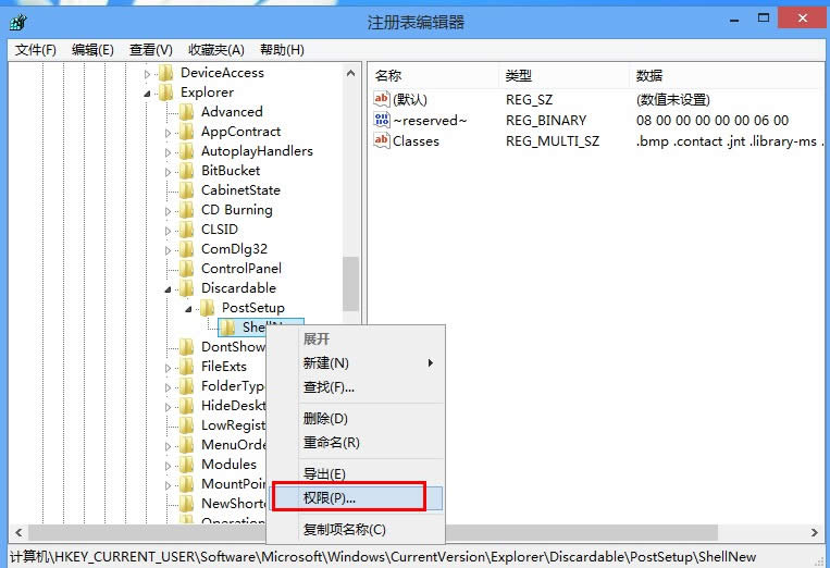 3.順序調(diào)整完畢后,重新右鍵ShellNew點(diǎn)擊權(quán)限。