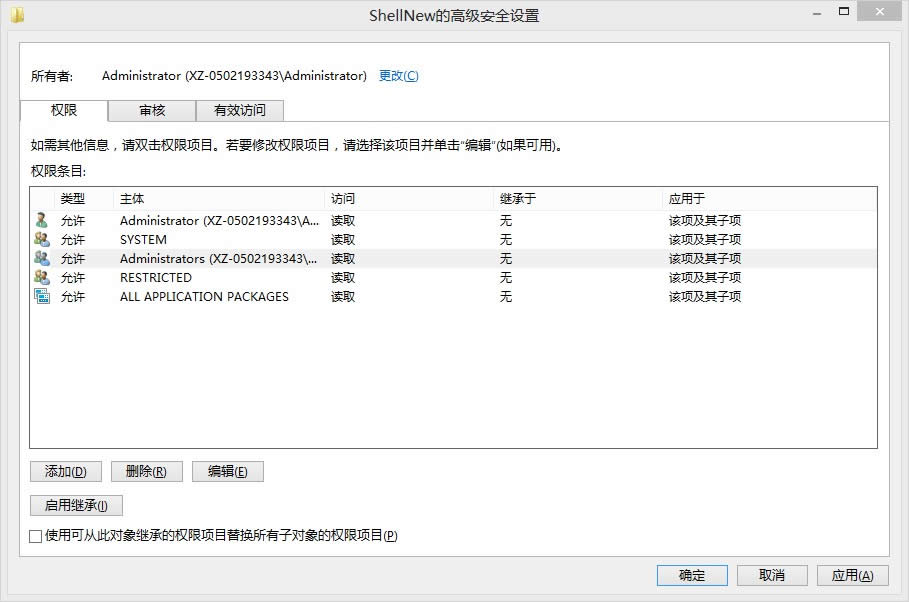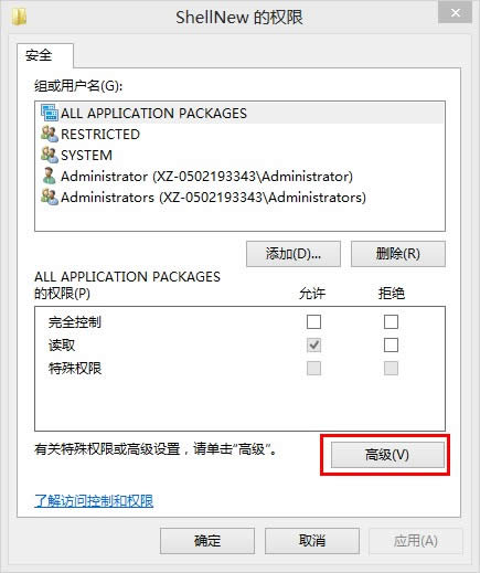 5.在ShellNew的高級(jí)安全設(shè)置中一共有5個(gè)選項(xiàng),這里需要更改前三個(gè)選項(xiàng)。這里以第一個(gè)為例