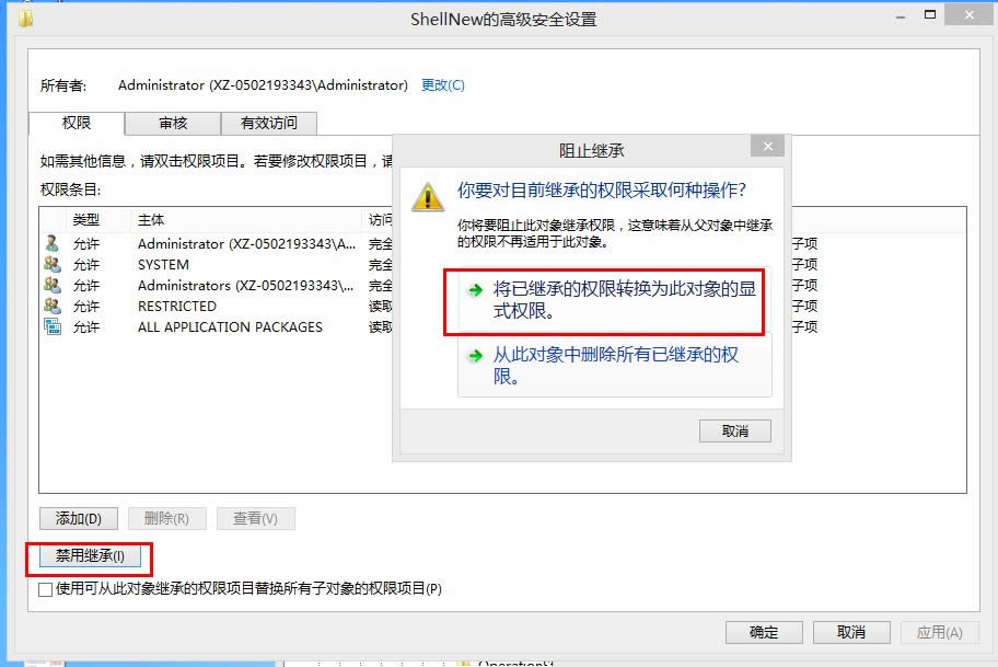 6.選擇“禁用繼承”,彈窗提示框后選擇“將已繼承的權(quán)限轉(zhuǎn)換此對(duì)象的顯示權(quán)限”。點(diǎn)擊確定即可。