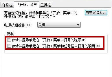 第三步、在“開始”菜單”選項卡,我們不想存儲最近應(yīng)用程序和項目的選項,可以吧“隱私”選項組中的兩個勾選去掉,再點擊“應(yīng)用”和“確定”。