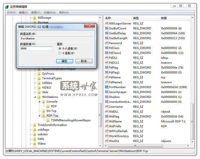 在RDP-Tcp子鍵所對(duì)應(yīng)的右側(cè)顯示區(qū)域中,我們同樣會(huì)看到一個(gè)名為PortNumber的子鍵,把該子鍵的數(shù)值也要一并修改過(guò)來(lái),例如這里我們也要將它的數(shù)值修改成“9999”;