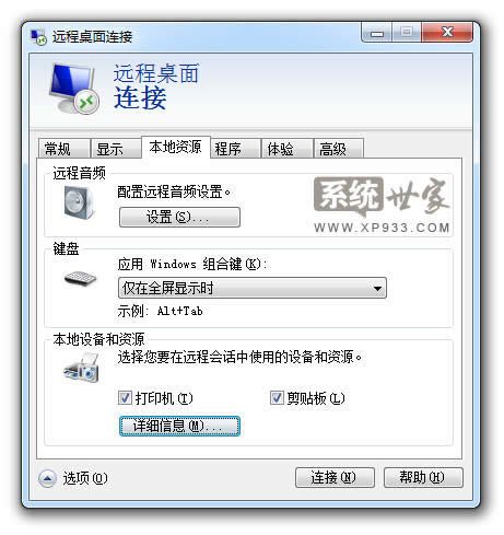 單擊該界面中的“選項(xiàng)”按鈕,并在其后彈出的選項(xiàng)設(shè)置窗口,單擊“本地資源”標(biāo)簽,打開(kāi)如圖所示的標(biāo)簽設(shè)置頁(yè)面選中其中的“打印機(jī)”,“剪貼板”項(xiàng)目,再單擊“連接”按鈕,開(kāi)始進(jìn)行遠(yuǎn)程桌面連接。