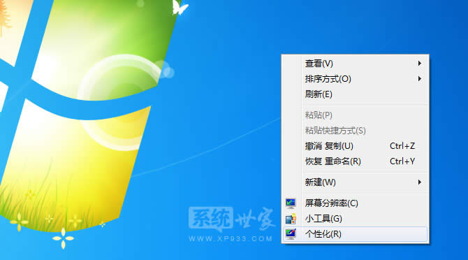 一、在windowx7的桌面隨便一個空白位置,點擊鼠標右鍵,在彈出的菜單中,點擊進入“個性化”設(shè)置選項,如下圖所示: