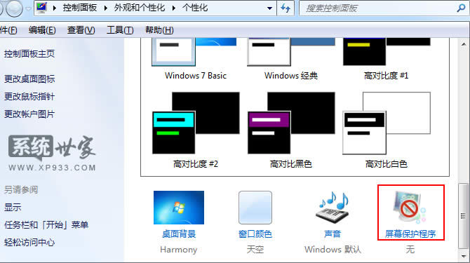 二、點擊win7系統(tǒng)個性化后,就會彈出一個窗口,如下圖顯示,我們再點擊底部 的“屏幕保護程序”如下示意圖所示: