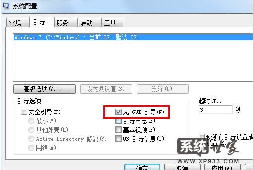 在跳出來的win7系統(tǒng)配置窗口中,我們選擇引導(dǎo)的服務(wù)選項(xiàng),列表中出現(xiàn)的選項(xiàng)其實(shí)就是咱們的win7開機(jī)畫面了,只需要在下面的引導(dǎo)選項(xiàng)中的“無GUI引導(dǎo)”前勾選上即可關(guān)閉win7的開機(jī)畫面了!