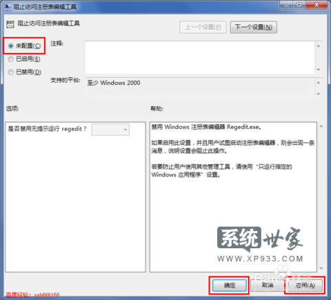 將“已啟用”改為“未配置”或者“已禁用”,然后點擊右下方的應(yīng)用和確定按鈕,設(shè)置完成,現(xiàn)在我們在運行里面輸入regedit 回車就可以打開和修改注冊表了