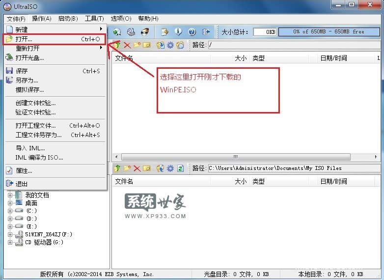 打開ultraiso之后,選擇文件--打開--選擇剛才下載的WinPE.ISO,如圖