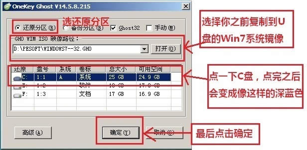 接下來,在Onekey ghost選擇還原分區(qū),在GHO WIM ISO映像路徑中選擇你之前復(fù)制到U盤里的Win7系統(tǒng)鏡像Windows7.GHO,然后點(diǎn)擊底下的C盤,如下圖