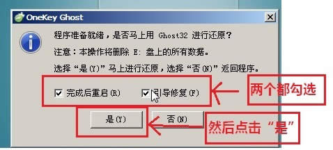 彈出來一個(gè)提示框,詢問是否進(jìn)行還原,先把完成后重啟和引導(dǎo)修復(fù)都勾選上,然后點(diǎn)擊確定,如圖