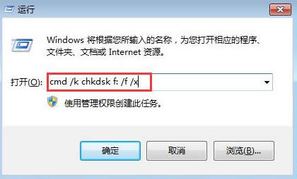 win+r鍵調(diào)出運(yùn)行操作命令,然后輸入cmd /k chkdsk f: /f /x,其中f為出現(xiàn)問(wèn)題的盤符,按回車鍵確定;