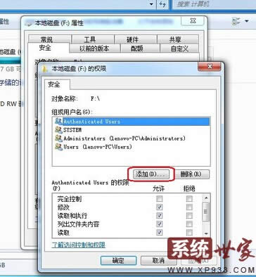 接下來,我們將屬性窗口切換到安全欄目下,然后點擊編輯選項。接下來點擊添加。
