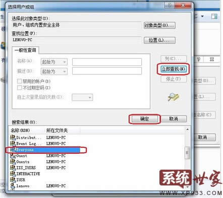 在新彈出來的選擇用戶組界面中,我們點擊最底部的高級選項,然后找到右邊的立即查找,這個時候底部會出現(xiàn)查找的選項,我們找到win7 everyone權(quán)限就好,選中并點擊確定。