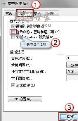 之后在選項(xiàng)標(biāo)簽中,確認(rèn)提示名稱、密碼、憑證等這個(gè)選項(xiàng)前沒(méi)有打勾,然后,點(diǎn)擊確定,如下圖: