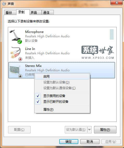 3.接著右擊“立體聲混音”選擇“啟用”;如下圖所示: