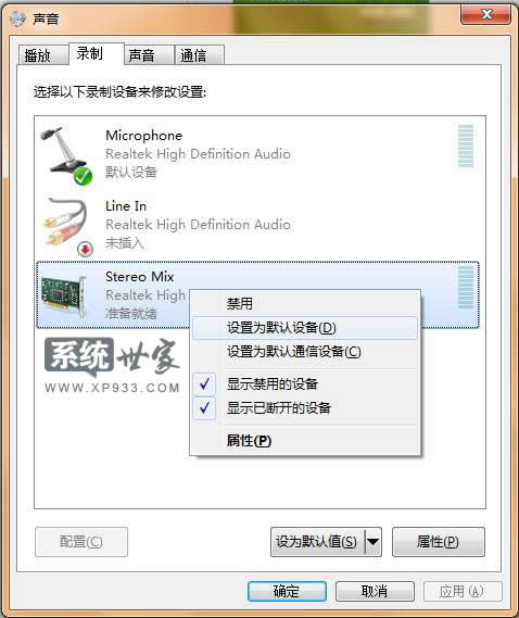 4.最后繼續(xù)使用鼠標右擊“立體聲混音”點擊“設(shè)置為默認設(shè)備”;如下圖所示: