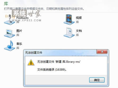 在Win7中使用“庫(kù)”功能可以讓電腦中的文件更易于管理和查找。在默認(rèn)情況下,Win7系統(tǒng)會(huì)提供文檔庫(kù)、音樂庫(kù)、圖片庫(kù)和視頻庫(kù)這幾個(gè)常用庫(kù)。當(dāng)然,我們也可以根據(jù)需要或自己的使用風(fēng)格在Win7系統(tǒng)中創(chuàng)建自己的庫(kù)。“庫(kù)”功能是Win7系統(tǒng)才開始出現(xiàn),它可以幫你把文件更好的分類,可以創(chuàng)建文檔庫(kù)、音樂庫(kù)、圖片庫(kù)和視頻庫(kù)等,也可以新建庫(kù)。但是最近,有朋友向小編詢問(wèn),自己在電腦上新建“庫(kù)”的時(shí)候,出現(xiàn)了“無(wú)法創(chuàng)建文件 ‘新建 庫(kù).library-ms’文件系統(tǒng)錯(cuò)誤(16389)”的提示信息,正如下圖所示。