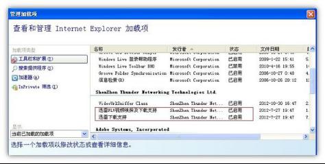 2、查看管理加載項(xiàng)是否未啟用或不齊全的問(wèn)題。在瀏覽器點(diǎn)擊“工具——internet選項(xiàng)——程序——管理加載項(xiàng)”,查看是否有”迅雷下載支持和迅雷FLV視頻嗅探及下載支持“這個(gè)兩個(gè)控件而且確保已經(jīng)啟用,如果沒(méi)有則重新安裝,禁用的情況點(diǎn)擊啟用即可。