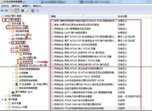2、在打開的組策略編輯器中,依次展開“計(jì)算機(jī)配置——Windows設(shè)置——安全設(shè)置——本地策略——安全選項(xiàng)”。