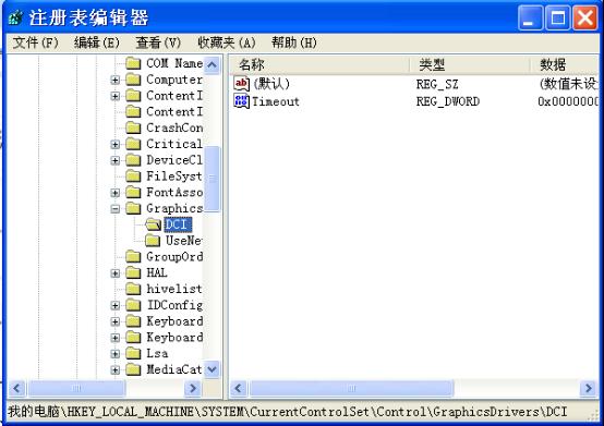 3、 在注冊(cè)表編輯器中依次定位到HKEY_LOCAL_MACHINE\SYSTEM\CurrentControlSet\Control\GraphicsDrivers\DCI。