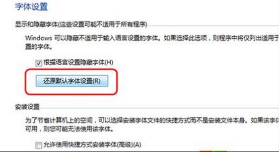 2、在字體設置界面的“字體設置”中,有一個“還原默認字體設置”的按鈕,左鍵單擊,此時按鈕變灰。此時所有Win7的默認字體就恢復了。