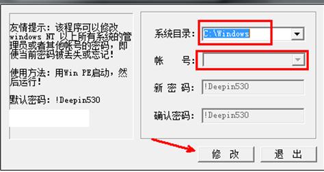 ?4、如圖所示,此工具即可用來修改系統(tǒng)的密碼,在箭頭所指位置選擇系統(tǒng)文件的目錄。選擇之后,在下面輸入你的用戶名,在下面輸入你的新的密碼,兩次正確輸入之后,點(diǎn)擊修改。