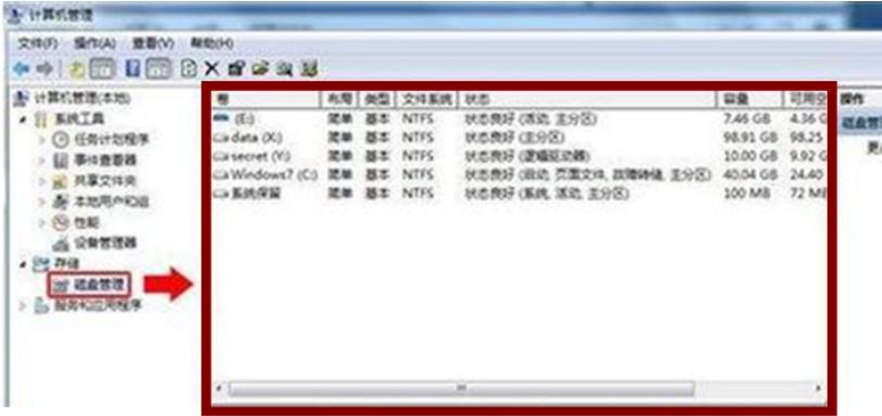 1、右擊 “計(jì)算機(jī)”,選擇 “ 管理”。彈出“計(jì)算機(jī)管理”窗口左側(cè)選擇“磁盤管理” ,就會(huì)出現(xiàn)中間的界面。