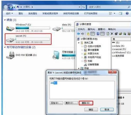 2、右擊右側(cè)的Y盤,選擇“更改驅(qū)動(dòng)器號(hào)和路徑”。在彈出的窗口中選擇“ 刪除” ,注意這時(shí)Y盤還是在“ 計(jì)算機(jī)” 文件夾下看得見的。