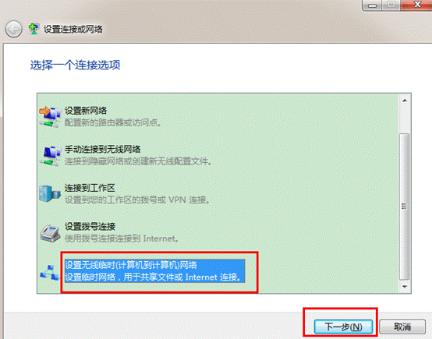 2、在彈出的“設置連接或網絡”窗口中,選擇“設置無線臨時(計算機到計算機)網絡”項,然后點擊下一步按鈕,在彈出的窗口中再次點擊下一步按鈕。
