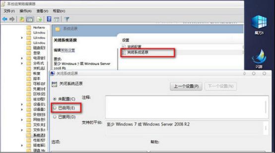 在組策略編輯器中依次展開(kāi)“計(jì)算機(jī)配置→管理模板→系統(tǒng)→系統(tǒng)還原”,在右側(cè)雙擊“關(guān)閉系統(tǒng)還原”,設(shè)為“啟用”。