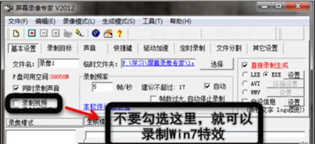 2、在軟件主界面上,默認是開啟“錄制視頻”的,所以特效就不能錄制,將“錄制視頻”前面的鉤去掉,這樣就可以錄制WIN7特效了,非常簡單。