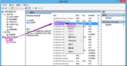 2、在彈出的管理界面,在服務和應用程序下面的點擊“服務”選項,在出現(xiàn)的右側(cè)服務列表中找到并右擊“windows firewall”,選擇“啟用”即可。