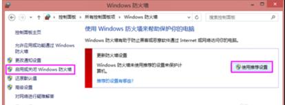 2、在彈出的窗口中,點擊“使用推薦設置”或“啟用windows防火墻功能”來啟用防火墻即可。