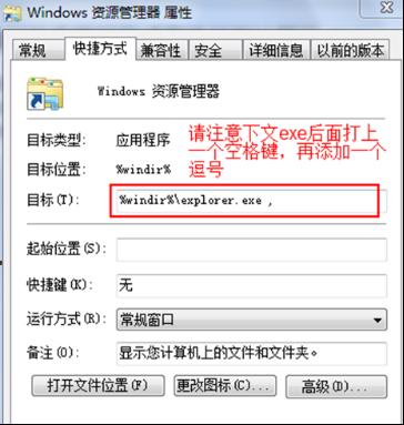 2、在Windows資源管理器屬性中切換到快捷方式選項(xiàng)。目標(biāo)中輸入請(qǐng)注意,在exe的后面,打上一個(gè)空格鍵,然后再添加一個(gè)逗號(hào)