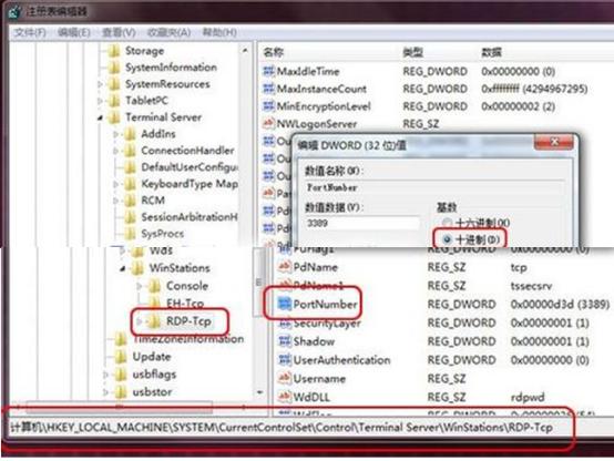 2. 在“注冊表編輯器”依次定位到 “HKEY_LOCAL_MACHINE\System\CurrentControlSet\Control\TerminalServer\WinStations\RDP Tcp\PortNumber”。