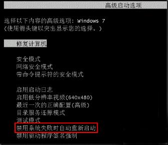 如果不能進(jìn)入系統(tǒng)設(shè)置的話,在啟動過程中長按“F8”鍵進(jìn)入高級啟動選項,選擇“禁用系統(tǒng)失敗時自動重新啟動”后按回車。