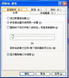 2、在打開的“回收站屬性”窗口,選擇“全局”標(biāo)簽頁(yè),把“回收站的最大空間”調(diào)至0%,點(diǎn)擊“確定”保存即可。