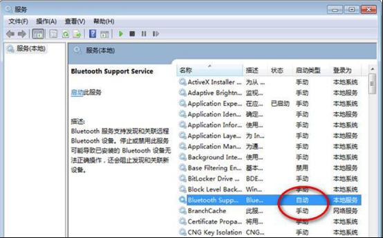 3、在彈出的“Bluetooth Support Service”服務(wù)設(shè)置窗口中,將啟動類型設(shè)置為自動,并將啟動改為服務(wù),藍(lán)牙功能開啟了。