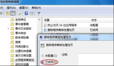 2、運(yùn)行組策略編輯器,依次展開到“計(jì)算機(jī)配置”→“管理模板”→“Windows組建”→“應(yīng)用程序兼容性”,然后在右側(cè)窗口中雙擊“刪除程序兼容性屬性頁”,此時(shí)你會(huì)發(fā)現(xiàn),該項(xiàng)設(shè)置已經(jīng)處于“已啟用”狀態(tài)!